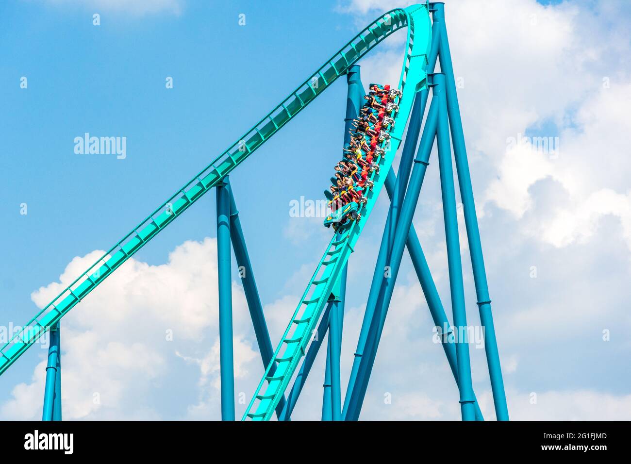 Canada S Wonderland Leviathan Roller Coaster Achterbahnpark Kart Nimmt Eine Kurve Die Menschen Spuren Die G Kraft Einer Achterbahn Im Vergnugungspark Stockfotografie Alamy